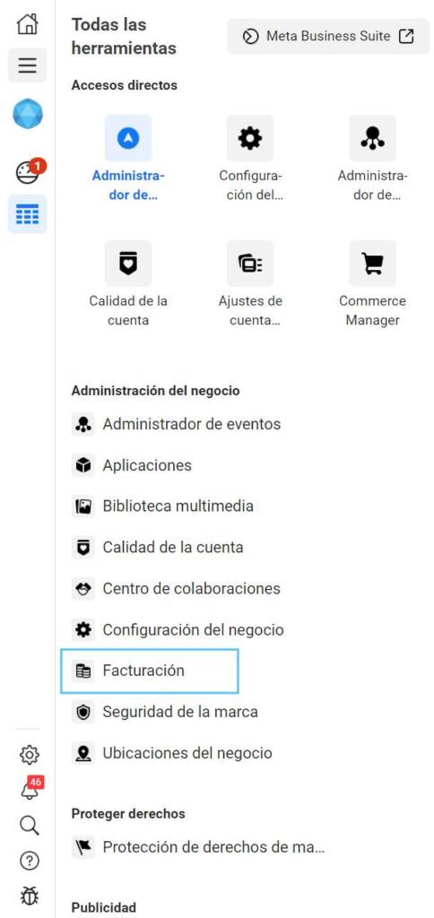 Una vez nos encontramos en nuestro Administrador, debemos dirigirnos a la parte izquierda nuevamente y desplegar el menú de «Todas las herramientas«. Una vez se muestra el menú, elegimos la opción «Facturación«.