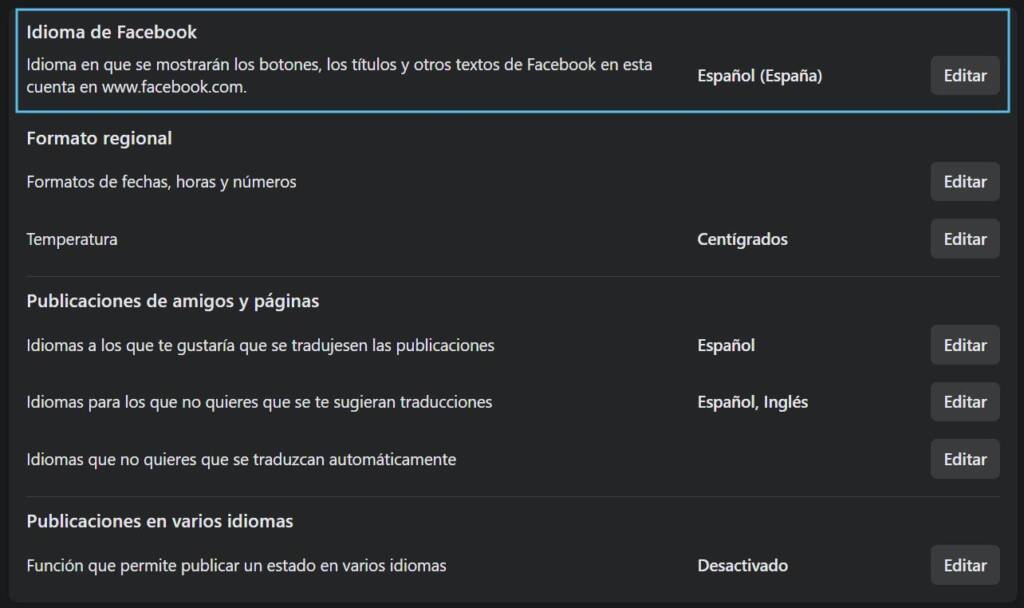 Procedimiento para cambiar el idioma de la cuenta de Facebook