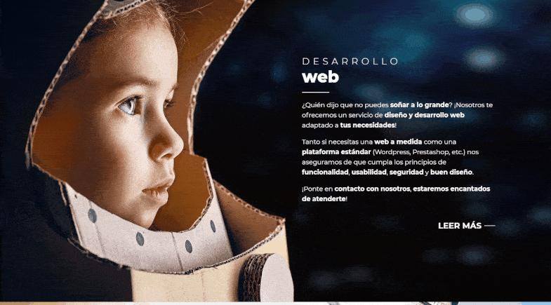 Las imágenes y los vídeos a pantalla completa pueden ser impactantes y funcionan genial para llamar la atención. Una vez que al usuario le llama algo la atención, pasa más tiempo en la aplicación o en la página y hay más posibilidades de que continúe navegando por la misma. Nosotros utilizamos este recurso en nuestra página corporativa, ¿aún no la has visto?